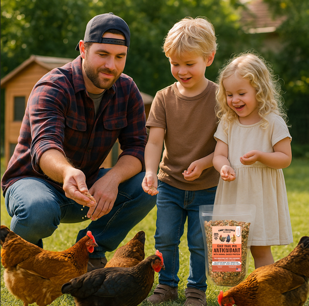 Introducing Coop Cravings Coop Trail Mix Antioxidant Blend, a wholesome and nutritious scatter treat for your chickens.